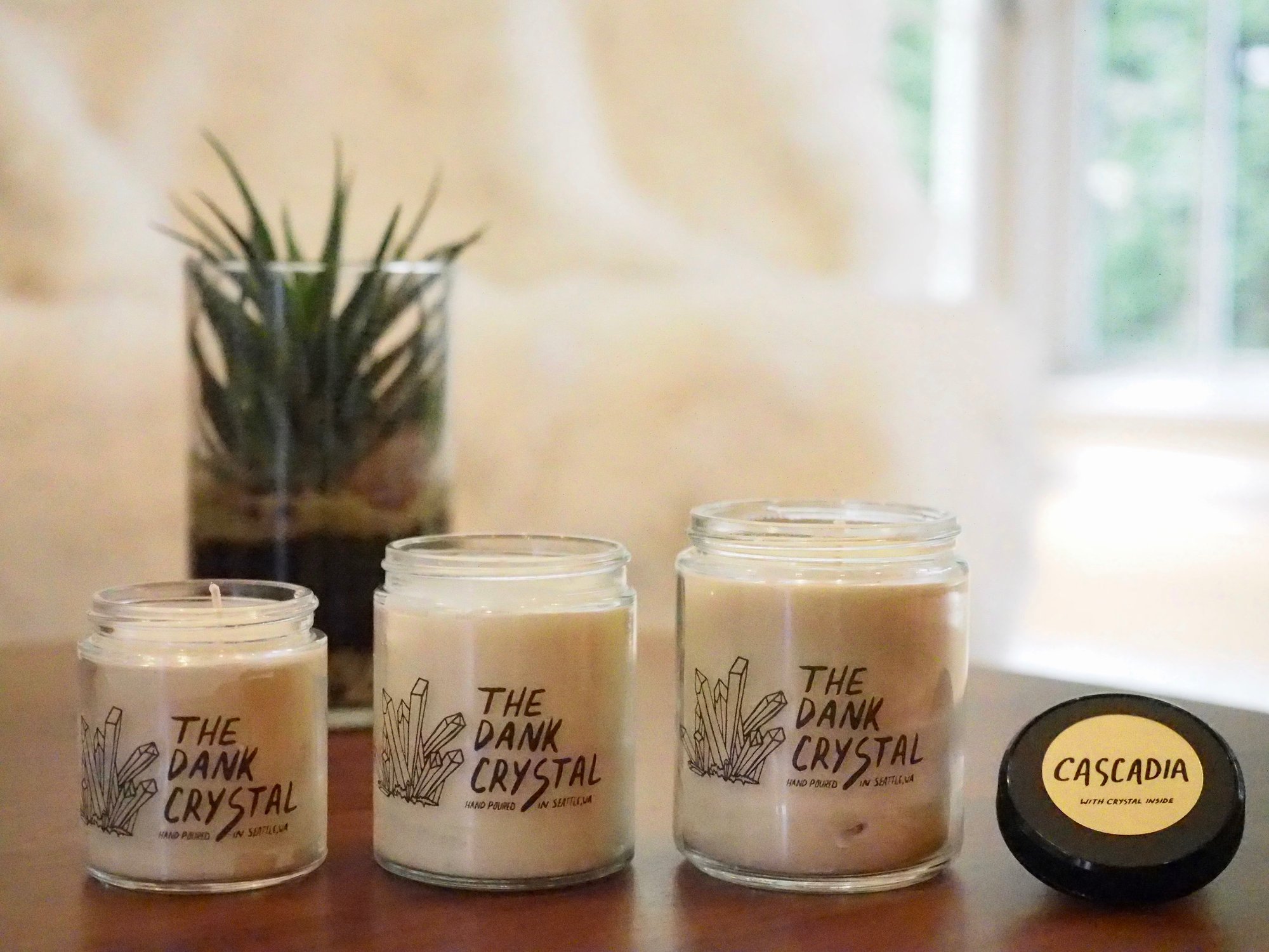 Each Dank Crystal candle is hand poured with soy wax in a clear glass jar, enveloping a purified crystal within.
